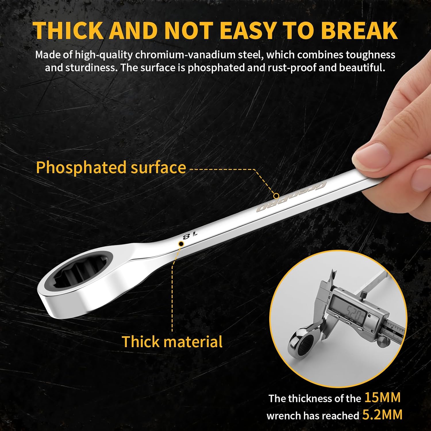 A standout feature of this wrench set is the 72-tooth ratcheting mechanism, which allows for a 5° swing arc. This feature is particularly valuable in tight spaces where conventional wrenches may struggle to operate efficiently.